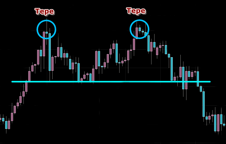 Yükselen bir piyasa bir seviyeyi test ettiğinde, geri çekildiğinde ve daha sonra bu seviyeyi tekrar test ettiğinde bu kalıbı görürüz. Ancak seviyeyi kıramaz ve fiyat düşer. Burada görülen iki yüksek noktanın aynı fiyat civarında olduğunu unutmayın. Aynı seviyede olan iki tepeyi gösteren bu formasyon bu nedenle the double top adını almıştır. Bu formasyon piyasanın kilit direnç seviyesini kırmaya yetecek kadar yükseliş momentumuna sahip olmadığını gösterir.