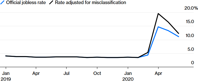 Düzeltilmiş işsizlik oranının, düzeltilmemiş versiyondan daha hızlı düşmesi, işgücü piyasasında neler olduğuna dair bir ipucu sunuyor. Birçok işveren, şok geçene kadar işçileri evde tuttu, sonra geri çağırdı. Bu işçilerin bazıları maaşlarını düzenli alıyordu ve bu kişiler işe geri çağrılan ilk işçiler oldular. Bu yüzden düzeltilmiş işsizlik oranı düzeltilmemişe oranla daha hızlı düştü.