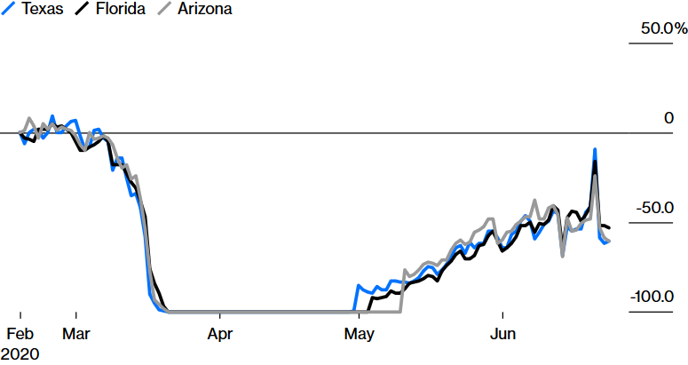 Bloomberg - Texas, Florida ve Arizona'da bir önceki yıla göre restoran doluluk oranları değişimi