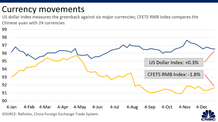 Nispeten güçlü bir ABD ekonomisi ve yatırımcıların güvenli liman varlık tercihi, dolara olan talebi artırdı ve 2019 için para biriminin değerini yükseltti. Buna karşılık, Çinli yetkililer yuanın yıl boyunca değer kaybetmesine izin verdiler. Bu hareket, ABD Başkanı Donald Trump'ın Çin'e para manipülasyonu suçlamaları yöneltmesine yol açtı. Ancak Uluslararası Para Fonu (IMF), yuanda görülen hareketlerin ve para biriminin değerinin Çin'in ekonomik temelleri ile uyumlu olduğunu söyledi.