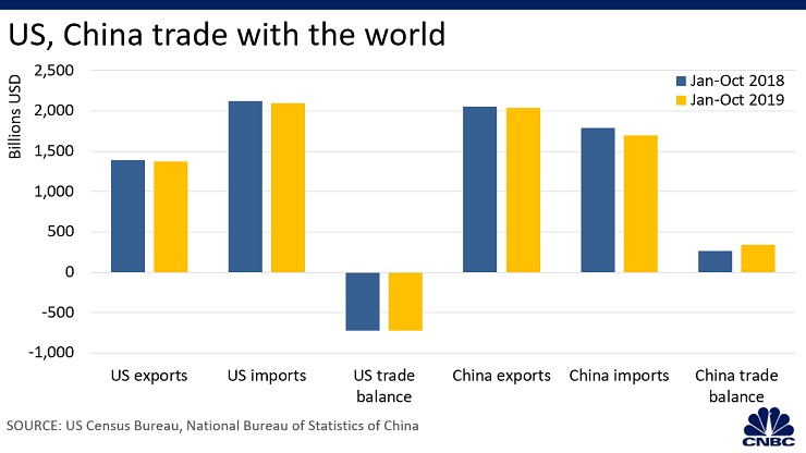 Her iki ülkede de genel ihracat ve ithalat bir yıl öncesine göre 2019'un ilk on ayında düşüş gösterdi. Bu durum dünya çapında daha yavaş ticaret faaliyetlerinin yaşandığı bir zamanda görüldü. Bazı uzmanlara göre, bu düşüşler ABD-Çin ticaret savaşından daha önce başlamış ve bir trend haline gelmiştir. Çoğunlukla Çin ile yaşanan ekonomik dengesizlikten kaynaklı ABD ticaret açığı, yıl içinde çok fazla değişiklik göstermedi. ABD verilerine göre, Ocak-Ekim 2018 döneminde 344,5 milyar dolar olan ABD ticaret açığı, bir yıl sonra 294,5 milyar dolara geriledi.
