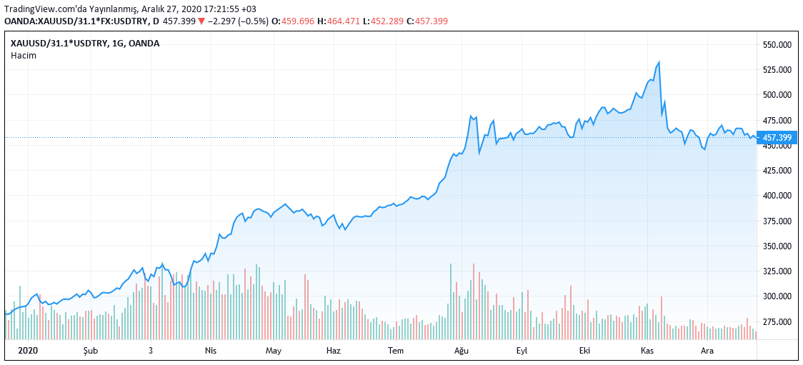 Gram altına baktığımızda da çeyrek altında olduğu gibi bir yükseliş grafiği karşımıza çıkıyor. Gram altın, 2020 yılına yaklaşık 250 TL'den başladı ve 6 Kasım'da rekor kırarak 530 TL'yi geçti. Son günlerde 450 TL civarında fiyat görüyor.