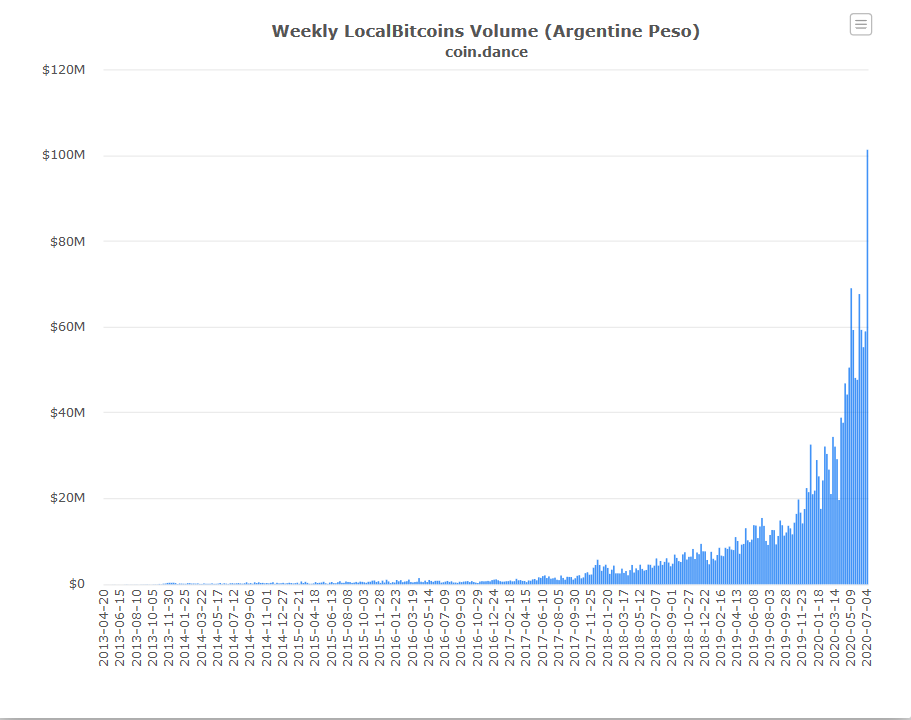 Yerel para birimi olarak, Arjantinliler 27 Haziran'da sona eren haftada 59 milyon peso değerinde Bitcoin yatırımının ardından ertesi hafta 100 milyon peso seviyesini aşmaya çalıştı ve ABD doları bazında, haftalık BTC hacminde 500.000 dolardan 808.000 dolara kadar yükseldi.