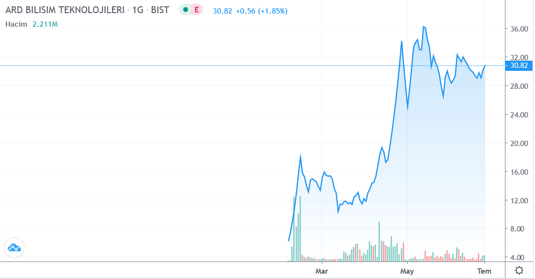 ARDYZ.IS hissesi 52 haftalık en düşük 6.36 TRY fiyatını; en yüksek ise 38.84 TRY fiyatını gördü.