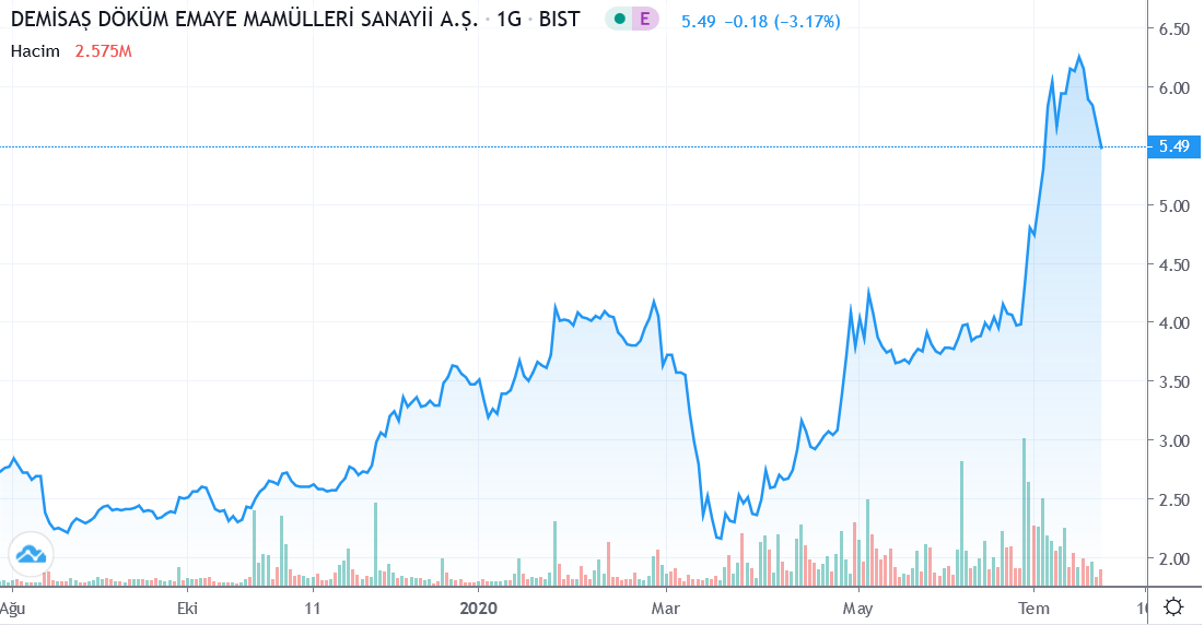 DMSAS.IS hissesi 52 haftalık en düşük 2.06 TRY fiyatını; en yüksek ise 6.47 TRY fiyatını gördü.