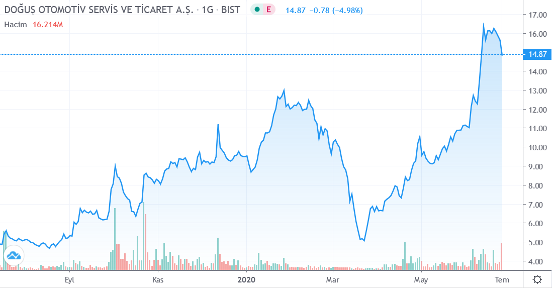 Güne 14.65 TRY fiyattan başlayan Dogus Otomotiv Servis ve Ticaret A.S. hissesi en son kapanış fiyatına (14.87) göre -1.61% değişimle 14.63 fiyattan kapattı. Gün içerisinde en düşük 14.25; en yüksek 14.91 seviyelerini test eden DOAS.IS hissesi bir önceki kapanış fiyatına (14.87) göre değişimi -0.24 TRY oldu. Günlük işlem hacmi ise 1.39M adet olarak gerçekleşti.