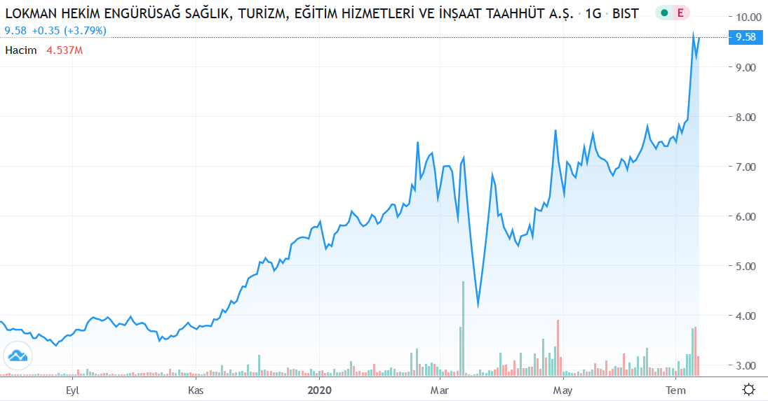 Güne 9.65 TRY fiyattan başlayan Lokman Hekim Engurusag Saglik, Turizm, Egitim Hizmetleri ve Insaat Taahhut A.S. hissesi en son kapanış fiyatına (9.58) göre 0.73% değişimle 9.65 fiyattan kapattı. Gün içerisinde en düşük 9.65; en yüksek 9.65 seviyelerini test eden LKMNH.IS hissesi bir önceki kapanış fiyatına (9.58) göre değişimi 0.07 TRY oldu. Günlük işlem hacmi ise 18.04K adet olarak gerçekleşti.