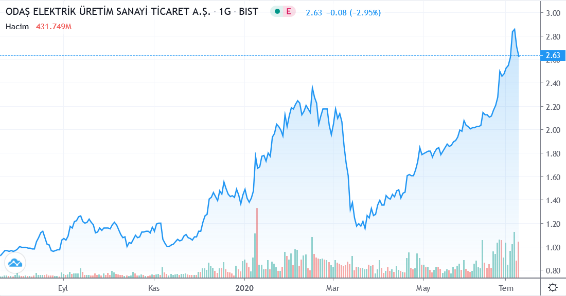 Güne 2.75 TRY fiyattan başlayan Odas Elektrik Uretim Sanayi Ticaret A.S. hissesi en son kapanış fiyatına (2.71) göre -2.95% değişimle 2.63 fiyattan kapattı. Gün içerisinde en düşük 2.56; en yüksek 2.83 seviyelerini test eden ODAS.IS hissesi bir önceki kapanış fiyatına (2.71) göre değişimi -0.08 TRY oldu. Günlük işlem hacmi ise 431.75M adet olarak gerçekleşti.
