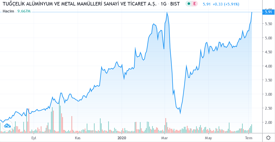 Güne 5.64 TRY fiyattan başlayan Tugcelik Aluminyum Ve Metal Mamulleri Sanayi Ve Ticaret A.S. hissesi en son kapanış fiyatına (5.91) göre 0.00% değişimle 5.91 fiyattan kapattı. Gün içerisinde en düşük 5.57; en yüksek 6.01 seviyelerini test eden TUCLK.IS hissesi bir önceki kapanış fiyatına (5.91) göre değişimi 0.00 TRY oldu. Günlük işlem hacmi ise 9.67M adet olarak gerçekleşti.