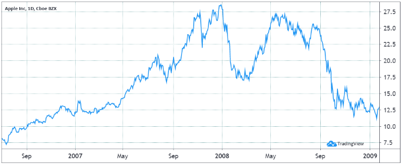 Yukarıdaki grafiğe bakalım. 2007'nin ikinci yarısında %63'lük bir ralli gerçekleşmiş, ancak böyle bir dönemde bile -beş gün içinde- %22'lik bir fiyat düşüşüyle karşılaşmış. 2008 yılının başlarında, AAPL bir aydan daha kısa bir sürede 28 dolar seviyesinden 18 dolara düştüğü için hissedarlar için zor bir zaman olmuştu. Bu dönemde Apple hisseleri S&P 500'ün 2008 yılının ilk çeyreğinde düşük performans (%29,5 oranında) gösterdi.