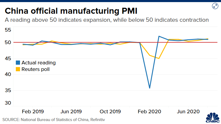 Çin'den gelen resmi imalat dışı Satın Alma Yöneticileri Endeksi (PMI) Temmuz ayında 54,2'den 55,2'ye yükseldi. Çok sayıda küçük, özel şirketi içeren Çin hizmet sektörü; ağır iş kayıpları, maaş kesintileri ve koronavirüste ikinci dalga korkusu gibi faktörler nedeniyle imalat sektörüne kıyasla daha yavaş bir toparlanma yaşıyor.