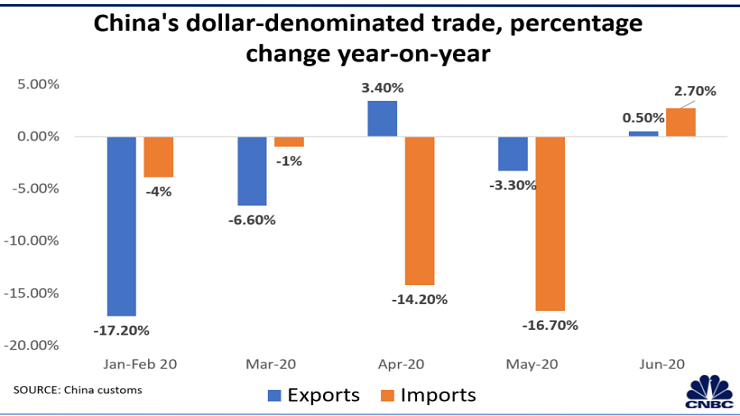 Reuters'in yapmış olduğu ankette, Çin'in Haziran ayındaki ihracatının bir önceki yıla göre %1.5 oranında daralması ve Mayıs ayına oranla %3.3'lük bir düşüş yaşanması öngörülüyordu. İthalatın ise Mayıs ayına oranla %16.7, geçen yıla göre ise %10.0 oranında gerilemesi bekleniyordu. Fakat tüm bu beklentiler boşa çıktı ve Çin'in dolar cinsinden ihracat ve ithalatı Haziran ayında artış gösterdi. Haziran ayı gümrük verileri, Çin'de ihracatın bir önceki yıla göre %0,5 oranında artması ve aynı dönemde ithalatın da %2,7 artış göstermesiyle beklentileri aştı.