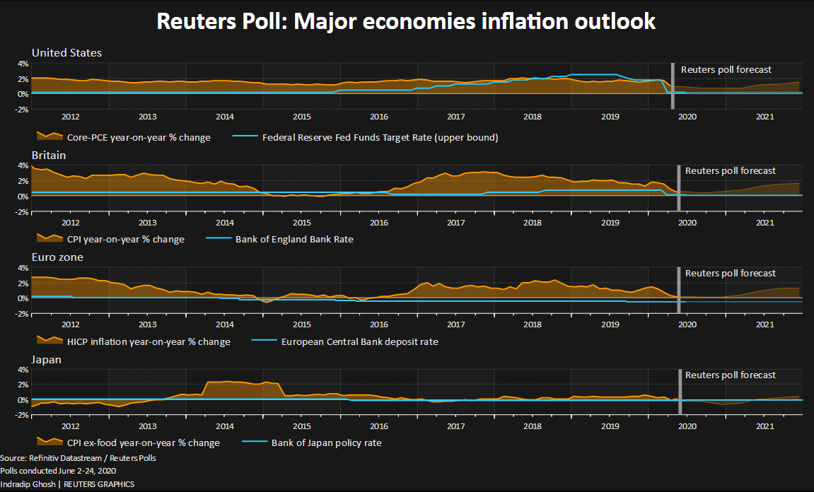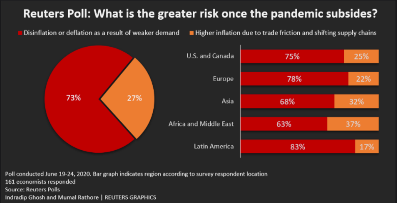 Grafik incelendiğinde 160'tan fazla ekonomistin %70'inden fazlası COVID-19 sonrası dünya için en büyük tehdidinin deflasyon ve daha düşük fiyatlar olacağı görülüyor. Bu da yıllardır düşük enflasyonla mücadele eden merkez bankaları için ciddi bir problem olacaktır. Aşağıdaki grafikte de gelişmiş ülke ekonomilerinin enflasyona dair beklentileri görülüyor: