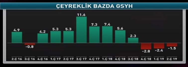 TÜİK verilerine göre GSYH ikinci çeyrek ilk tahmini; zincirlenmiş hacim endeksi olarak 2019 yılının ikinci çeyreğinde bir önceki yılın aynı çeyreğine göre %1,5 daraldı. Üretim yöntemiyle GSYH tahmini, 2019 yılının ikinci  çeyreğinde cari fiyatlarla %15 artarak 1 trilyon 24 milyar 226 milyon TL oldu.
