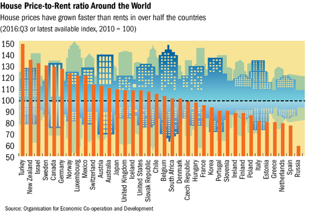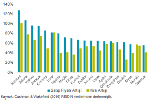 Türkiye ekonomisi konut satış fiyatlarının kiralara göre en hızlı arttığı ekonomi durumunda bulunuyor. Buna göre Türkiye’de konut satış fiyatlarındaki artış ile kiralardaki artış arasında 2010 yılından bu yana konut satış fiyatları lehine yaklaşık yüzde 50 oranında fark oluşmuş. Yani konut satış fiyatlarındaki artış kadar kiralar artmamış.