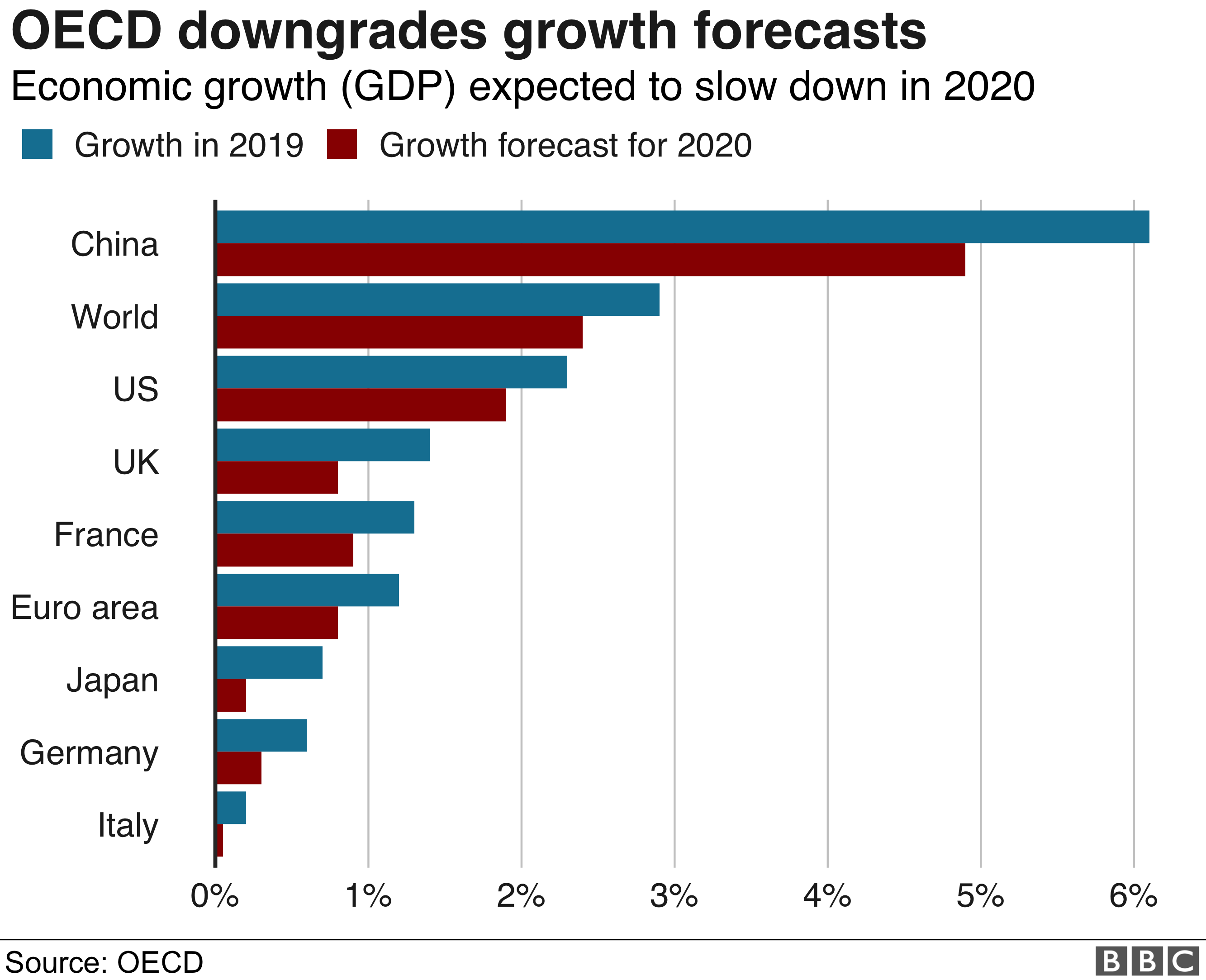 OECD, Kasım ayındaki %2,9 büyüme oranının 2020'de % 2,4'e gerileyeceğini tahmin ediyor. Ayrıca, daha uzun ömürlü ve daha yoğun bir salgının, fabrikaların faaliyetlerini askıya alması ve işçilerin virüsten kaçınmak için evde çalışmaya başlaması nedeniyle 2020'de ekonomik büyüme oranları yarıya inebileceğini de ekliyor.