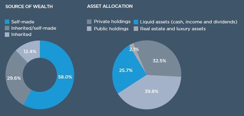 Milyarderlerin çoğunluğu servetlerini kendileri oluşturuyor (%58). %29.6'sı hem kendi çabasıyla hem de kalan mirasla oluştururken diğer kesim (%12.4) miras yoluyla servet sahibi olduğunu belirtmiş. Varlık tahsisine baktığımızda milyarderlerin en çok gayrimenkul ve lüks ürünlere yatırım yaptıkları görülüyor. Bunu %32.5 ile özel şirketler, %25.7 ile likit varlıklar ve %2.1 ile kamuya açık şirketler oluşturuyor.