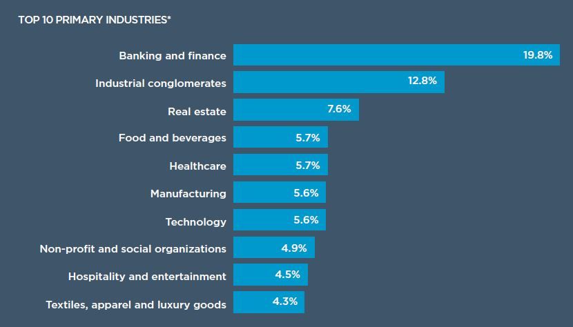 Milyarderlerin en çok bankacılık ve finans sektöründe olduğunu görüyoruz. Bunu sırasıyla endüstriyel holdingler, gayrimenkul, yeme-içme, sağlık, imalat, teknoloji, kar amacı gütmeyen kuruluşlar ve organizasyonlar, konaklama ve eğlence, tekstil gibi lüks ürünlerin bulunduğu sektörler izliyor.