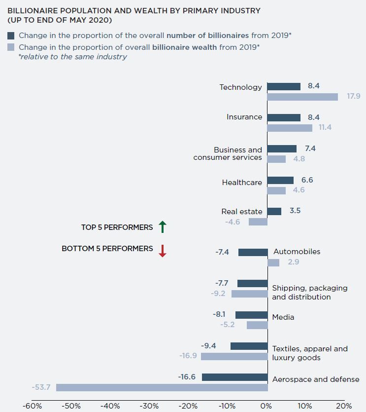 2020 yılının ilk 5 ayında milyarderlerin sigorta, teknoloji ve sağlık sektörlerine yaptıkları yatırım yükselirken taşımacılık, giyim ve havacılık sektörlerine yapılan yatırımlar ciddi şekilde düşmüştür. Bu nedenle, çoğunlukla teknoloji ve sigorta sektörlerine yatırım yapan milyarderlerin serveti sırasıyla %18 ve %11 oranında artmıştır.