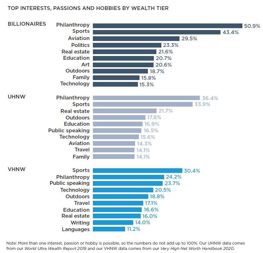 Hayırsever milyarderler, bunun yanında spor, politika ve gayrimenkulle çok ilgili. Seyahat, dil öğrenme, eğitim ve aile gibi alanlara olan ilgi ise oldukça düşük. Buradan milyarderlerin bireyselliğe düşkün oldukları sonucuna da varabiliriz. Raporda yazılanlara göre, milyarderler hayrıseverlik çatısı altında buluşuyorlar ve aktif olarak çeşitli organizasyonlarda hayır işleri yapıyorlar. Yani bireyler zenginleştikçe, "refah eşitsizliği" nedeniyle kendilerini topluma karşı daha sorumlu hissediyorlar. Bu da özellike son dönemde koronavirüsle mücadele kapsamında birçok milyarderin yaptığı bağışlarda görülebiliyor.