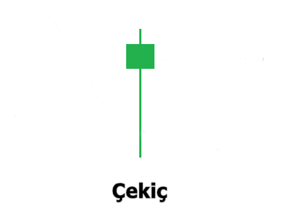 Bu tip, bir trendin dip seviyesinde ya da bir düşüş trendinde oluşur. Bu tipte mumun gövdesi kısadır ve altındaki kuyruk tam tersine, uzundur. Bu görüntüsüyle çekice benzer. Çekiç, satıcıların işlem gününde fiyatları aşağı çektiğini gösteriyor olabilir ama alıcıların alım/satım gününü daha da yukarı çekmeye geldiklerine işaret eder. Fakat burada trendin yükseldiğini doğrulayabilmek önemlidir. Bu nedenle dikkatli olun ve işlem hacmini kontrol etmeyi unutmayın.