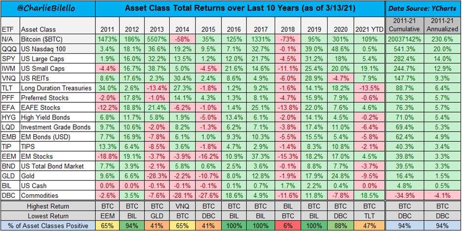 Bu durum, Ycharts'tan alınan verileri kullanarak en iyi varlık sınıflarının performanslarını derleyen Compound Capital Advisors'ın CEO'su ve kurucusu Charlie Bilello tarafından kamuoyuna sunuldu.