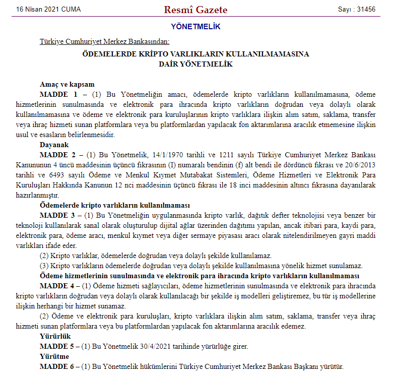16 Nisan Cuma günü yayınlanan Resmi Gazete'de ödemelerde kripto paraların kullanımının yasaklanacağı açıklandı. Karar, 30 Nisan'dan itibaren geçerli olacak.