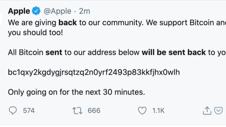 Apple'ın kurumsal hesabı, Amazon CEO'su Jeff Bezos, Microsoft kurucusu Bill Gates, Demokratik başkan adayı Joe Biden ve eski Başkan Barack Obama'nın da dahil olduğu birçok yüksek profilli Twitter hesabı Çarşamba günü saldırıya uğradı ve takipçilere bitcoin göndermelerini söyleyen tweetler atıldı.