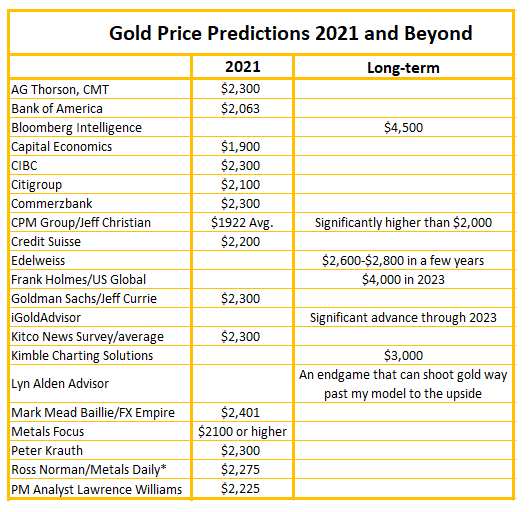 2021 yılı için yapılan fiyat tahminlerinin minimum 1900 dolar olduğu, maksimum ise 2401 dolar olduğu görülmekte. Bloomberg Intelligence'ın uzun vadeli altın tahmini ise 4500 dolar. Goldman Sachs ise %22'lik bir artış ve ralli bekliyor. Uzmanların genel olarak uzun vadeli tahminleri en aşağı 2000 dolardan başlıyor. Uzmanların 2021 yılı altın fiyat tahminlerinin ortalamasını alırsak 2228 dolara ulaşırız.