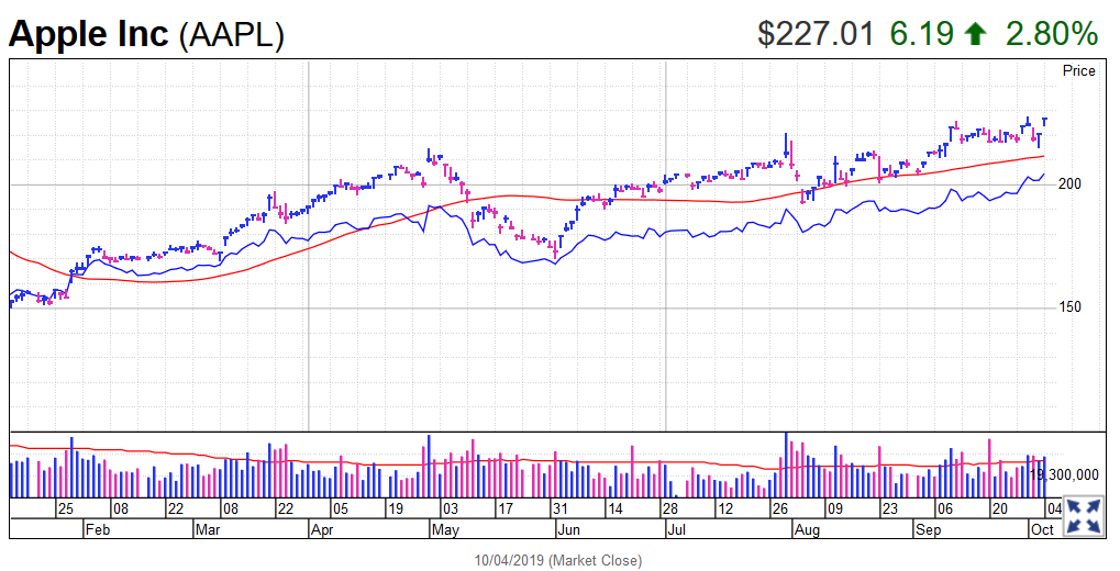 Apple hisse senetleri geçen hafta Dow Jones endeksinin 3 Ekim 2018 seviyesinin hemen altında % 3.7 artışla 227.01 seviyesine yükseldi. Hisse senetleri 221.47 seviyesindeki yatay pozisyonunun üzerinde kaldı. Apple hisse senedi için direnç noktası 11 ayın en yüksek seviyesinde.