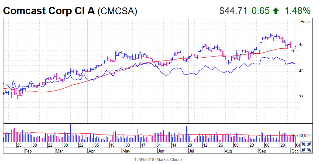 Comcast hisse senetleri geçtiğimiz hafta 10 sent düşerek 44.71'e geriledi ancak cuma günü 50 günlük çizgisine geri döndü. Comcast 4 Eylül'de 45.40'lık bir alım noktasını temizledi ancak son haftalarda geri çekildi.