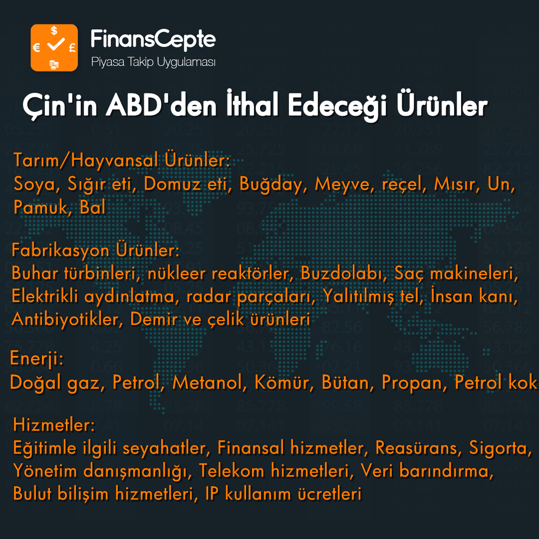 Çin, aşağıdaki ürünler dahil olmak üzere her bir büyük sektörden çeşitli ürünler satın almayı kabul etti: