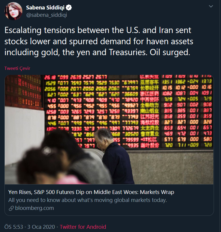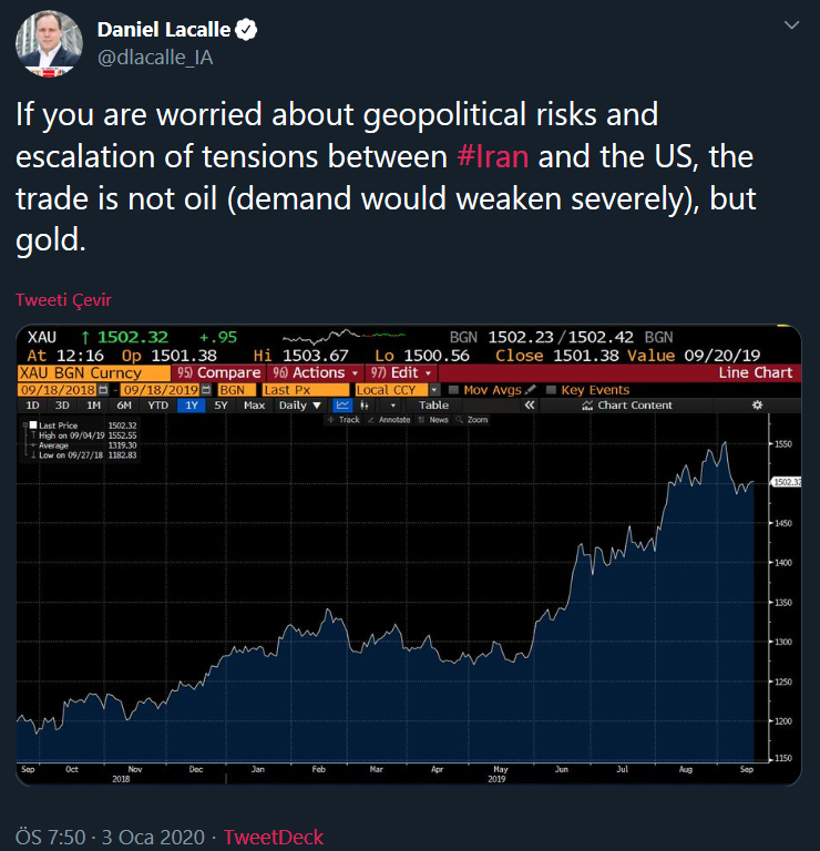 Ons altın 1.600 dolara yaklaştı. Buna ek olarak, Başkan Donald Trump, herhangi bir ABD hedefine misilleme yaparsa İran'a “orantısız bir şekilde” saldırmaya hazır olduğunu söyledi. Spot altın, Nisan 2013'ten bu yana en yüksek seviye olan % 2.3'e, yani 1.588.13 dolara yükseldi. Palladium % 1.5 artışla 2.019.73 dolara çıkarken gümüş ve platinde de yükselme görüldü.