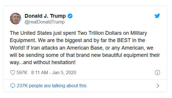 “Amerika Birleşik Devletleri, askeri teçhizata 2 trilyon dolar harcadı. Biz dünyanın en büyüğü ve en iyisiyiz! İran bir Amerikan üssüne veya herhangi bir Amerikalıya saldırırsa, bu yepyeni ve güzel ekipmanlardan bazılarını onlara hiç tereddüt etmeden göndeririz!"