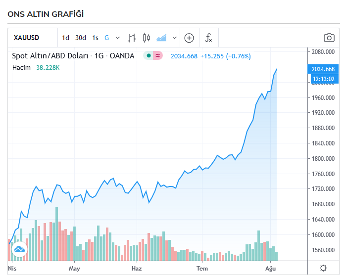 Spot altın (XAU) 2.030,72 dolar seviyesine çıkarak yeni bir rekor kırdı. Altın fiyatları, 2020 yılında yaklaşık %33 artmış oldu.