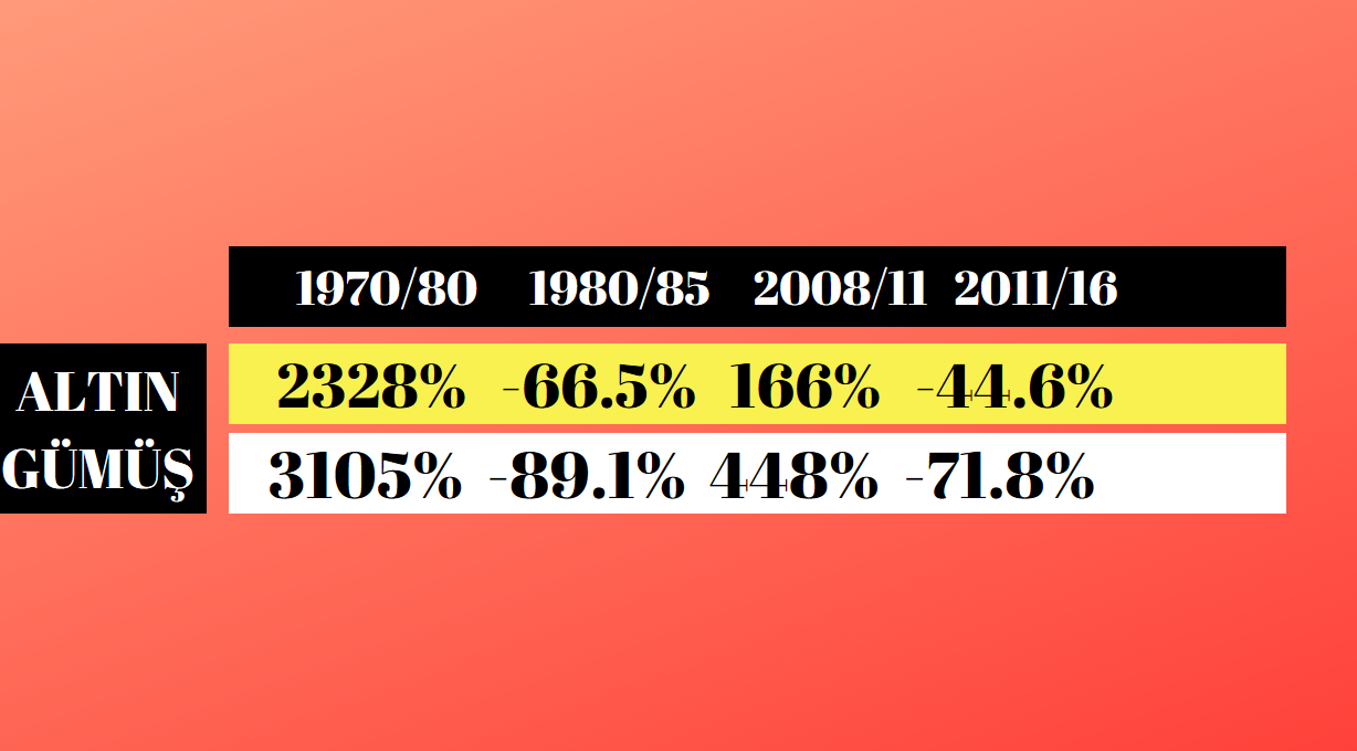 Modern tarihin en büyük boğa ve ayı piyasalarından bazılarında altın ve gümüşün nasıl performans gösterdiğine dair bazı örnekler: