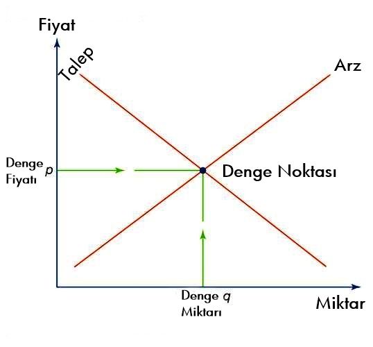 Yukarı doğru eğimli arz eğrisi ve aşağı doğru eğimli talep eğrisi ile, bir noktada ikisinin kesişeceğini görselleştirmek aslında kolaydır. Bu noktada piyasa fiyatı, tedarikçileri tüketicilerin bu fiyattan ödeme yapmak istemelerine ve aynı miktardaki ürünü piyasaya sürmeye teşvik etmede yeterlidir. Yani arz ve talep dengelidir.