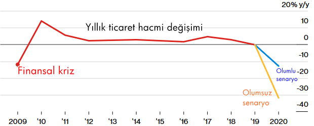 Dünya Ticaret Örgütü'nün geçen hafta 2020 yılı için açıkladığı iyimser senaryosu, uluslararası mal ticaret hacminde %13'lük düşüş olduğu açıklamasıyla gölgelendi. Bundan önceki en büyük düşüş, ekonomik kriz sırasında ticaret hacminin %12 oranında gerilediği 2009 yılında gerçekleşmişti. Kötümser senaryolar, küresel mal ticaret hacminin bu yıl %32 oranında düşeceğini öngörüyor.