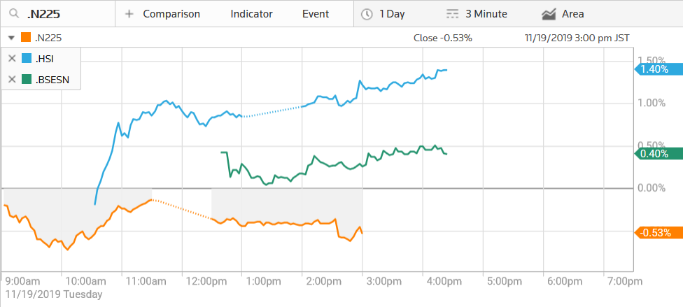 Hong Kong'un Hang Seng Endeksi (HSI) kırmızı renkle güne başladı ama en son %1 civarında işlem gördü. Hong Kong hisse senetleri, geçen haftadan sonra endeksin şehirdeki protestoların ortasında kaydettiği gerginliklerin zararlarını hafifletmeye çalışıyor.