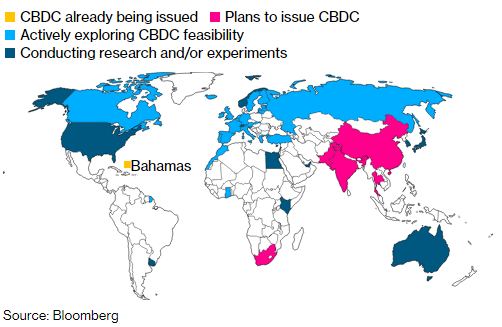 Grafikte görüldüğü gibi birçok ülkede CBDC çalışmaları sürüyor. Türkiye de aktif olarak dijital para çalışmalarını sürdürüyor.