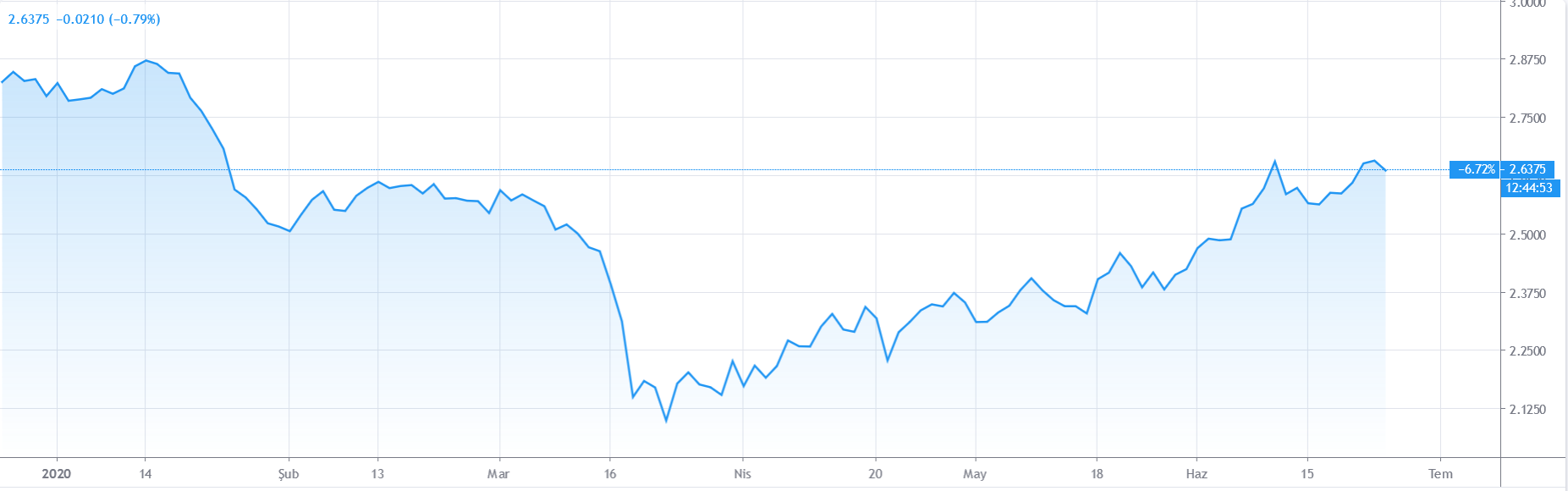 Bakır fiyat grafiği: 2,6500 seviyelerinde fiyatlanıyor.