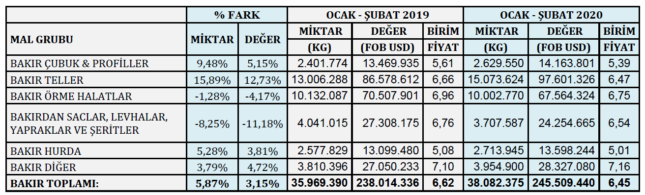 "2020 Ocak-Şubat Dönemi; Bakır sektöründe geçtiğimiz yılın aynı dönemine göre 2020 yılının ilk 2 aylık döneminde değerde % 3,15 oranında artış ve miktarda da %5,87 oranında artış yaşanarak 245,5 milyon dolar değerinde; 38 bin ton ihracat gerçekleştirilmiştir."*