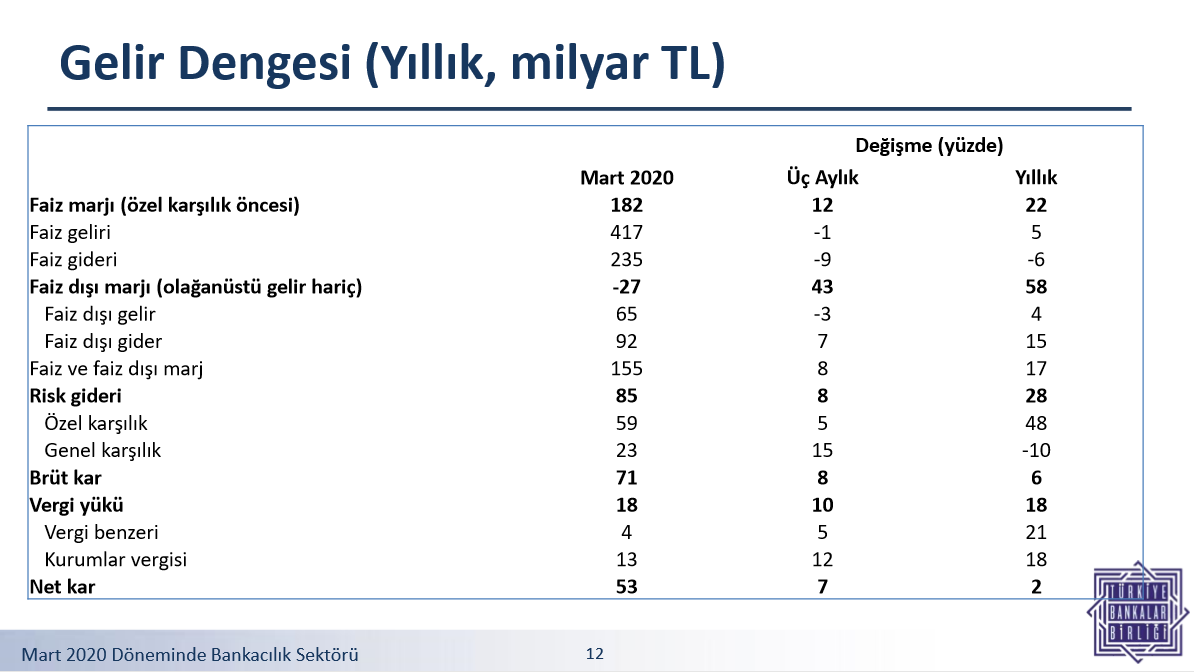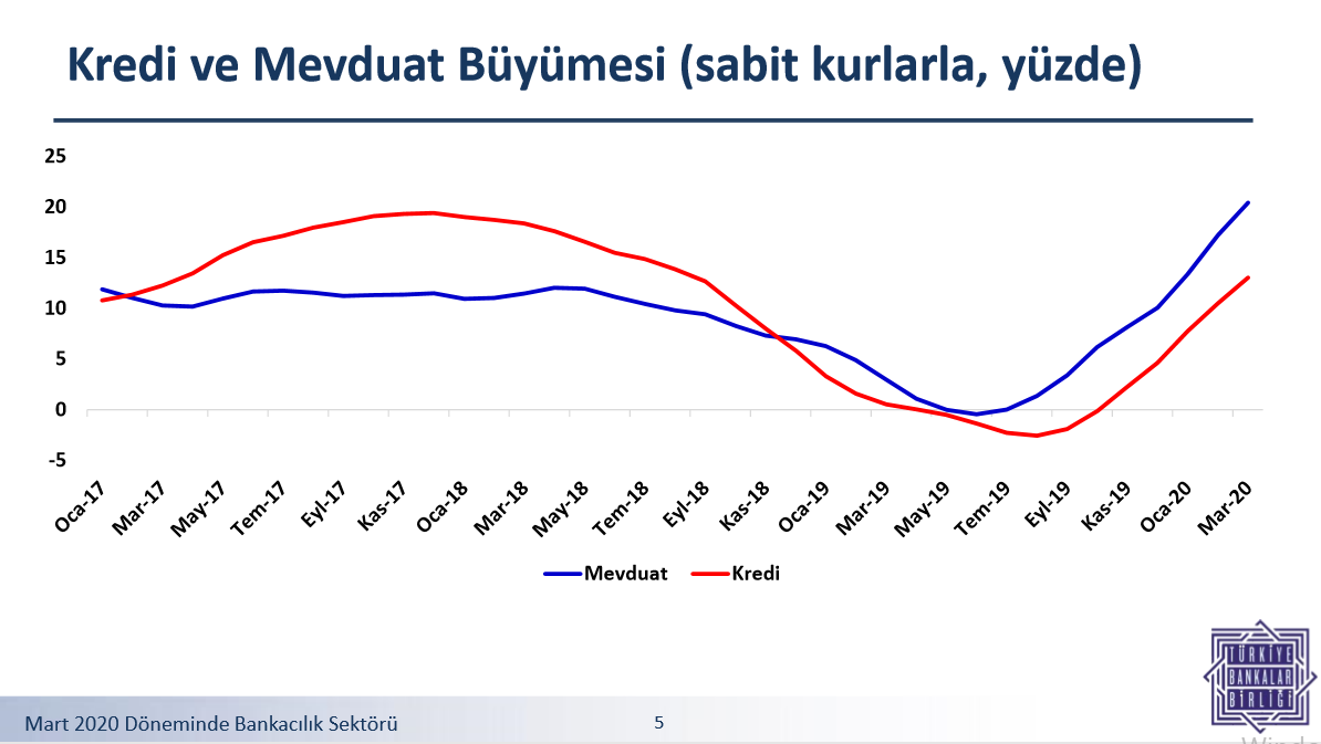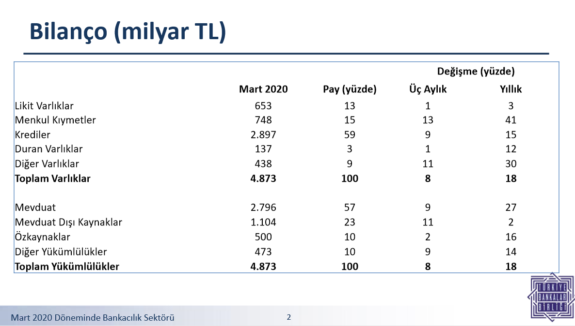 2019 yılsonuna göre sektörün aktif büyüklüğü %8,5, krediler toplamı %9,1, menkul değerler toplamı ise %13,2 oranında artmıştır. Bu dönemde kredilerin takibe dönüşüm oranı %4,96 olmuştur. Bankaların kaynakları içinde, en büyük fon kaynağı durumunda olan mevduat 2019 yıl sonuna göre %8,9 artışla 2.796.185 milyon TL olmuştur. 2019 yılsonuna göre özkaynak toplamı %1,6 artışla 500.170 milyon TL olurken, Mart 2020 döneminde sektörün dönem net kârı 15.794 milyon TL, sermaye yeterliliği standart oranı ise %17,90 seviyesinde bulunmaktadır.