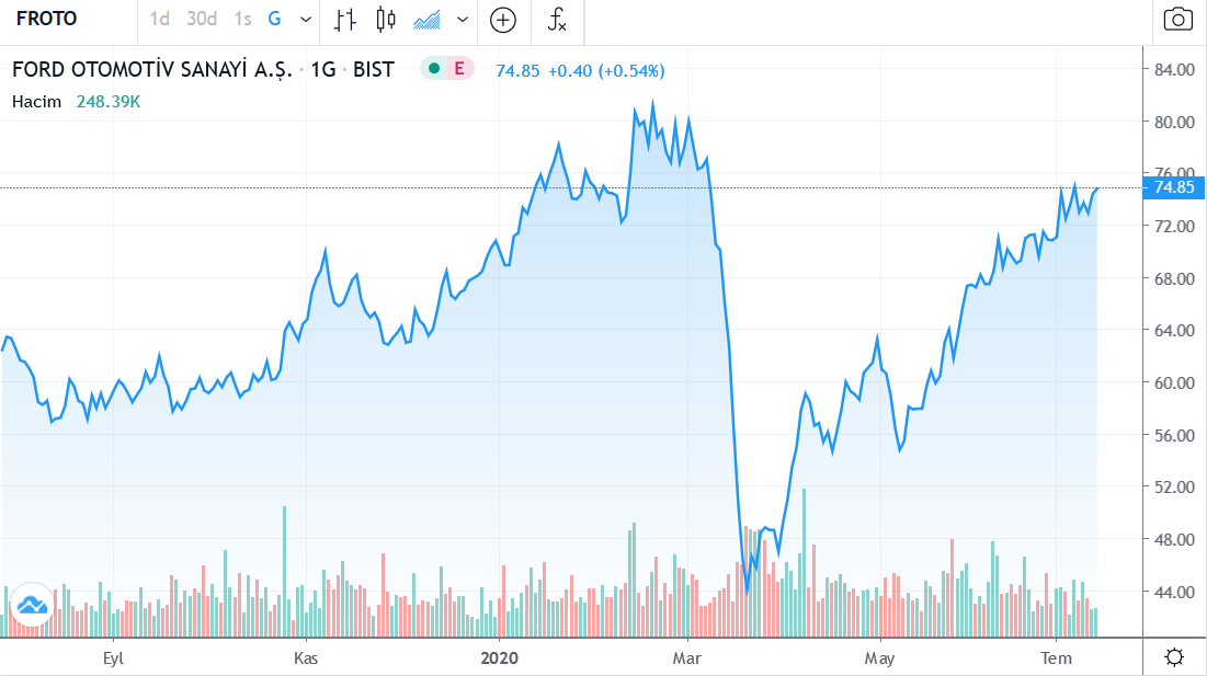 Güne 75.40 TRY fiyattan başlayan Ford Otomotiv Sanayi A.S. hissesi en son kapanış fiyatına (74.85) göre 2.00% değişimle 76.35 fiyattan kapattı. Gün içerisinde en düşük 75.30; en yüksek 76.65 seviyelerini test eden FROTO.IS hissesi bir önceki kapanış fiyatına (74.85) göre değişimi 1.50 TRY oldu. Günlük işlem hacmi ise 30.82K adet olarak gerçekleşti.