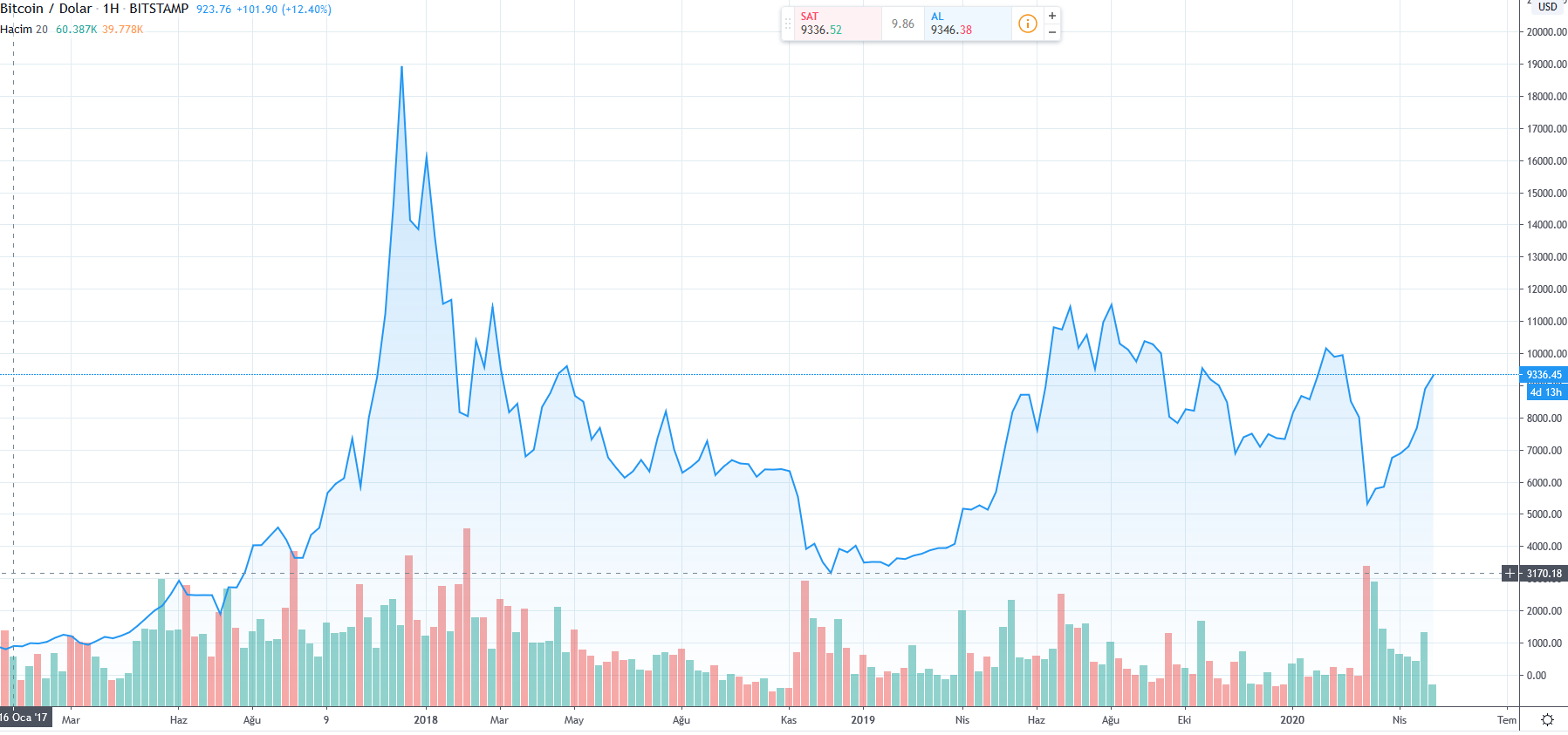 Temmuz 2018 ve Haziran 2019 arasındaki Bitcoin fiyatına bakalım: