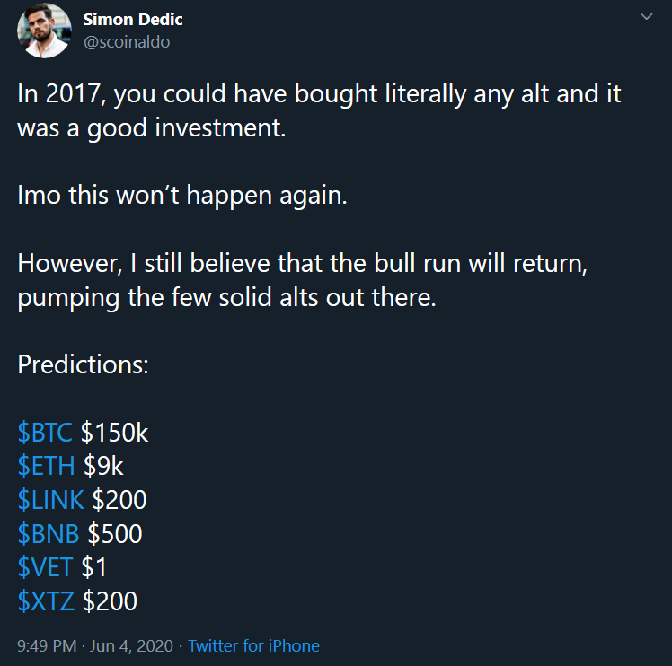 Simon Dedic, Bitcoin'in en çok yükselen kripto para birimi olacağını ve Bitcoin ile birlikte 5 altcoinin yıldız gibi parlayacağını söyledi. Dedic, attığı bir tweette kripto piyasasında yeni bir boğa rallisinin başlamasını beklediğini, ancak yükseliş trendinin her kripto varlık için geçerli olmayacağını belirtti.