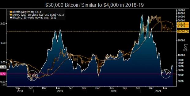 Mike McGlone, Bitcoin fiyatının 2019 yılının başındaki durumuna değinerek analizini temellendiriyor. McGlone, BTC'nin 2019'da 4 bin dolarda bir temel atmış olduğunu ifade etti ve buna benzer şekilde bu yıl Bitcoin'in 100 bin dolar için 30 bin dolarda bir zemin oluşturduğunu söyledi.