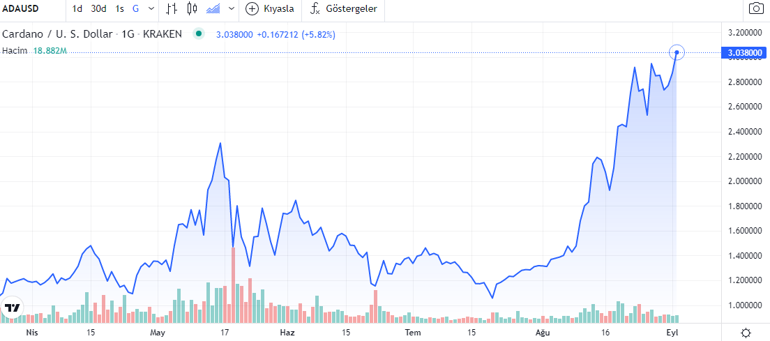 Charles Hoskinson'ın kurucusu olduğu Cardano'nun kripto parası ADA, 2 Eylül'de 3,09 dolara çıkarak rekor kırdı. İlk defa 3 doları aşmayı başaran ADA; 1 yılda %2345, 1 ayda %131 ve 2 haftada %44 oranında değer kazandı.