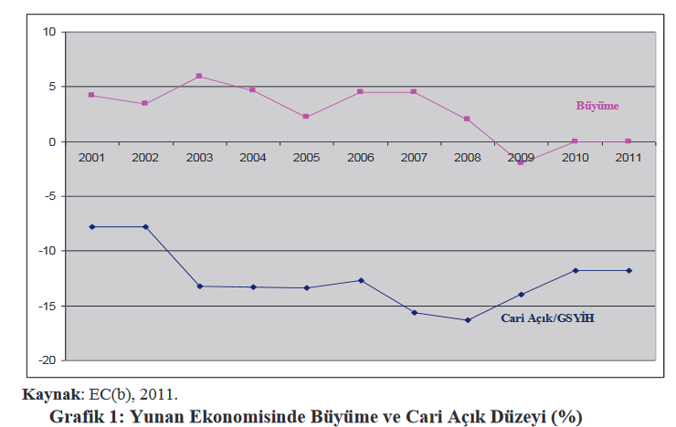 görüldüğü üzere Yunan ekonomisinde cari açık/GSYİH oranı, literatürde ekonomi açısından tehlike sınırı kabul edilen %5 düzeyinin oldukça üzerinde seyretmiştir. 2003 yılından itibaren ise ülkeden net gelir transferi önceki döneme göre ikiye katlanarak iki haneli rakamlara çıkmış, 2008 yılında cari açık/GSYİH oranı %16,3 seviyesine ulaşmış ve tarihi rekorunu kırmıştır." [3]