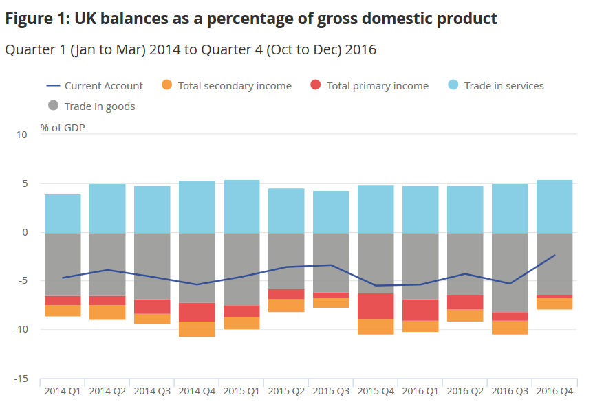 Birleşik Krallık'ta görülen cari açık, genel olarak ithalatı finanse etmek adına yüksek düzeyde borç almasından ileri geliyor. Ülkenin ihracatının büyük bir kısmını emtialar oluşturuyor ve emtia fiyatlarındaki düşüş yerli şirketlerin kazancının düşmesine yol açıyor. Bu düşüş, Birleşik Krallık'ın gelir akışını negatif yönde etkileyerek cari açığı artırıyor. Bununla birlikte, 23 Haziran 2016 tarihinde yapılan Brexit oylamasının sonucunda İngiliz sterlini değer kaybetti ve zayıflayan pound ülkenin mevcut borcunu yurt dışından gelen nakit akışının artmasını sağlayarak azalttı.